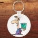 A man standing holding a box that has the word quality on it. This design looks really effective on this Keychain