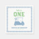 First birthday golf theme "Hole in One " with gold cart and light blue chequered plaid pattern.
