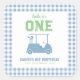 First birthday golf theme "Hole in One " with gold cart and light blue chequered plaid pattern.