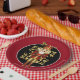 Holiday paper plate shown with a festive Christmas nutcracker print. Plate size 9" Plate color Garnet