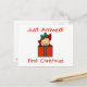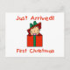 An adorable baby girl pops up from inside a brightly wrapped holiday gift and text reads "Just Arrived! First Christmas" on baby's first Christmas tote bags, T-shirts, and more.