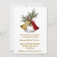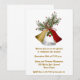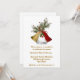 Festive holiday party invitation with white, red and gold bell, pine branch and red bow.