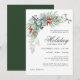 A simple sprig of pine, mistletoe and red and deep blue berries accent this tasteful elegant Holiday Party Invitation. It's a wonderful choice for business social events during the Christmas holiday season. The text pairing combines elegant script type face with traditional serif type face for a beautiful combination. The back of the invitation is a matching dark hunter green. You can edit this colour to any other colour if you desire. Personalise the text with your event details.