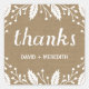This thank you sticker has a kraft-paper style background, white winter foliage, and the word "Thanks" written in a pretty bold calligraphy.