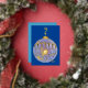 Tree ornament highlighted in gold foil. Purple and blue round globe with golden hook for hanging on a tree. On a dark blue background. Writing on ball reads "Peace on Earth" Greeting on light blue back "Wishing Peace and Happiness to Everyone"