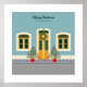 This festive and elegant Christmas illustration showcases a yellow façade of an old traditional Portuguese house adorned with wooden doors and windows and wrought iron balconies. Portuguese pavement graces the sidewalk, while two Christmas trees adorned with colourful Christmas balls stand by the entrance. A Christmas wreath graces the door. The scene captures the essence of the Portuguese Christmas in the streets—a harmonious blend of traditional architecture and joyful holiday spirit.