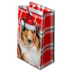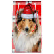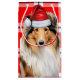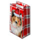 Dog lovers will adore receiving or giving this cute and funny holiday gift bag featuring an adorable Rough Collie wearing festive accessories on a plaid of shades of white and red.