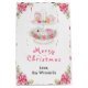 This fun and festive gift bag can be personalised with your name, relation or title. It features a watercolor cake stand with gingerbread cookies, macarons, candy, hot cocoa and a teapot. In the corners are beautiful pink poinsettia flowers. The text combines handwritten script and sans serif fonts for a stylish and modern look. This is perfect for Christmas gifts and party favours.