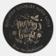 homemade baked good sticker with faux gold foil script in whimsical font "Merry and Bright" with decorative swirls and your info encircled on two tone backgrounds velvet black and red