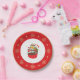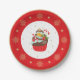 This paper plate features a holiday cupcake with a a candy cane decoration on top. The border around the plate is red with gold snowflakes and a gold outside edge.
