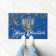 Blue with White text "Happy Hanukkah" in a fancy script with two Gold looking swirls of stars on each end.