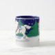 illustrated grey draught horses. On one side a clydesdale with a santa hat and beard bears bags of gifts. On the other a majestic draught gallops with christmas bells on his collar and a white dove design on his saddle. Winter scene with christmas trees and starry night sky behind. A lovely holiday mug for horse lovers.