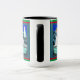 Beautiful Holiday Eskie and Angel Scripture Mug of a colourful, detailed winter scene with a soiled, homeless White American Eskimo Dog who is lost in a snowstorm. The dog is on bended knees and praying with paws together to a glorious Angelic Heavenly Being. She has a beautiful purple and white aura around her head and is at the entrance of a charming home. She has opened the iron gate for the lost dog and is welcoming the dog through the gate with outstretched hands. She has sanctified this home as the dog's new home by enveloping it with blue sparkles from Heaven. This scene accompanies the Bible verse Matthew 6:33, "But seek ye first the kingdom of God, and His righteousness; and all these things shall be added unto you." This Mug makes a wonderful gift or can be used to remind us of the Word of God.
