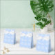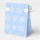 This Christmas holiday favour treat box is shown in a festive snowflakes print in colours of light blue and white.