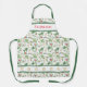 Festive Christmas holiday apron has a pattern of winter botanicals, holly and berries, pine boughs, tiny white flowers, red roses and rustic country cardboard cutout stars. You personalise with your name in red text at the top inside a panel lined with green stripes that match the green of the apron strings. At the bottom is a panel lined in green that has a row of the cardboard country cutout stars.