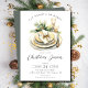 Our Christmas dinner invitation features an elegant holiday dinner place setting and green garland with the saying "eat, drink & be merry" The invitation is simple and elegant, with a white background and black text.