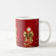 Elegant Merry Christmas / Happy Holidays mug with gold trees and bows on red.