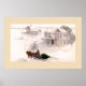This is a beautiful vintage illustration of a victorian home with the lights on in the windows and the holly is on the door while someone is going home with the Christmas tree. The background is my customized light dusty gold parchment paper pattern.