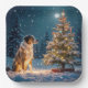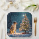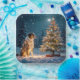 A dog sits beside a snow-covered Christmas tree adorned with lights and ornaments, basking in the glow of a serene, snowy night