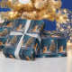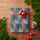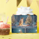 A dog sits beside a snow-covered Christmas tree adorned with lights and ornaments, basking in the glow of a serene, snowy night