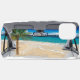 A beach extending into the car, with the sea and palm trees in the background.A city view is visible in the rearview mirror. Vector illustration.