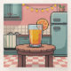 This coaster features a pixel art image of a cosy kitchen with a small wooden table as the central focus. On the table sits a tall glass filled with orange juice, garnished with a single orange slice, reflecting the light in a subtle glow. The kitchen features pastel pink walls, a retro teal refrigerator and a simple chequered floor, all with neat pixel lines. A string of fairy lights on the wall casts a warm and inviting ambiance on the scene. The coaster is a square glass coaster. The glass coasters are dishwasher safe.