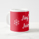 This jumbo size coffee mug is shown with a cute holiday message of Jingle Juice print with snowflakes.