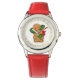 Kids holiday watch is shown in stainless steel with a holiday Christmas gingerbread man print. Red Strap.
