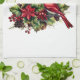 Holiday kitchen towel is shown in a lovely red cardinal bird print design.