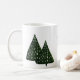 Personalized winter holidays mug with green trees and holiday toy drawing.
