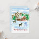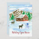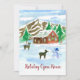 A "Holiday Open House" invitation card decorated with a little red cabin in the woods tucked up against a mountain range and everything is frosted with snow with deer in the front yard curious about the snowman illustrated with watercolor. You can edit the text to fit your needs.