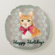 Watercolor orange tabby cat with festive red bow and multicolor snowflake background