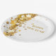 This paper plate is shown in a solid color of white with festive holiday gold stars print design.