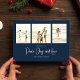 Classic and Simple yet elegant navy blue snowflake pattern, this design is completely editable. With calligraphy script. This festive, elegant, and unique multi-photo Christmas photo card template is a 1 photo layout. Celebrate with this unique holiday and festive Christmas card. This design features a Christmas holiday navy blue pattern, navy blue silver snowflakes, winter holiday elegant simple minimalist, fancy calligraphy script font, peace joy love quote saying, whimsical modern typography,1 photo family picture template, holiday Christmas photo greeting card, minimal simple pattern style, a four 4 photo grid layout