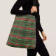 This cross-body tote bag is shown with a green and red Christmas holiday plaid print design.