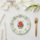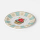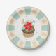This paper plate features a holiday cupcake with a red poinsettia decoration on top. The border around the plate is blue and cream with gold snowflakes and a gold outside edge.