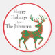 A red and green patterned reindeer personalised with your holiday greeting. Edit any of the sample text shown in the design template for custom stickers to use on your holiday packages, baked goods and more.