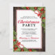 Rustic Christmas Party holiday invitation featuring a dark wooden background, corners decorated with christmas tree pine foliage, sparkly red xmas baubles, yummy candy sticks, twinkle fairy lights, and a holiday celebration template that is easy to personalise.