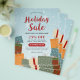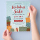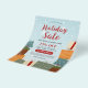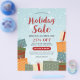 Holiday seasonal sale business marketing flyer features colourful decorative presents and a light sky blue snowy background with white snowflakes. Perfect for any of your businesses promotional and marketing needs.