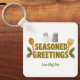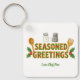 Fun holiday keychain, "Seasoned Greetings" with salt and pepper shakers and personalize it with chef's name for the cook you love and appreciate. Festive holly, spoon and fork frame the wording on this festive design. Cute "Spicy New Year" red and green chili pepper design on back!