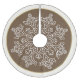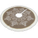 Holiday tree skirt shown in a latte brown colour with a snowflake print and coordinating border colour in ivory and matte gold colour.