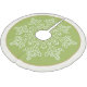 Holiday tree skirt shown in a fern green colour with a snowflake print and coordinating border colour in ivory and matte gold colour.