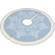 Holiday tree skirt shown in a antique blue colour with a snowflake print and coordinating border colour in ivory and matte gold-colour.