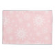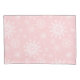 Pillowcase is shown in blush pink with a festive holiday Christmas snowflakes print.