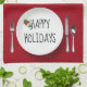 Happy Holidays text with a cute snowman on a round white plate and silverware on a red background.