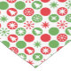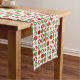This holiday table runner is shown with a festive Christmas trees and snowflakes print.