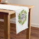 Table runner to accent your table decor is shown in a festive Christmas holiday holly wreath print.