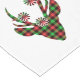 Holiday table runner is shown with a festive deer head print in a green and red plaid.