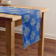 This table runner is shown with a Cerulean Blue colour background colour and has a festive holiday gold snowflakes print design.