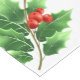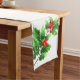 Holiday table runner is shown with a festive holly print design.